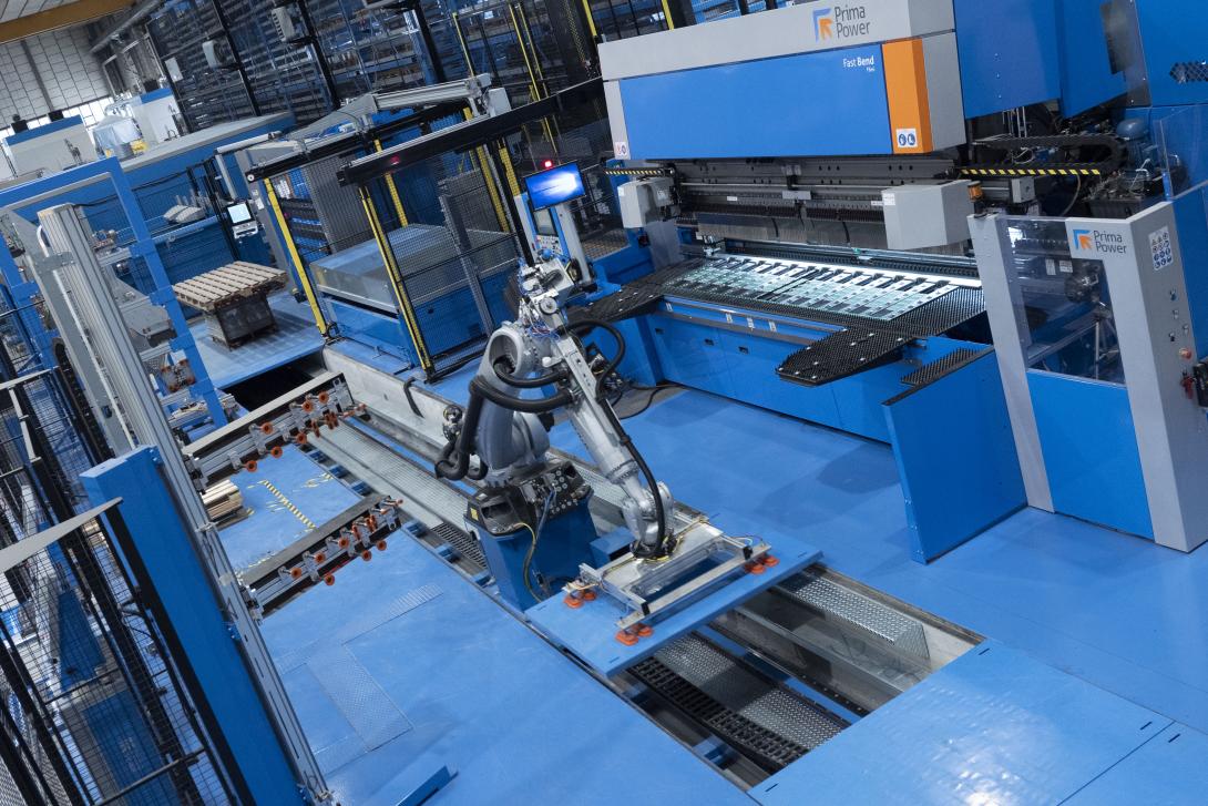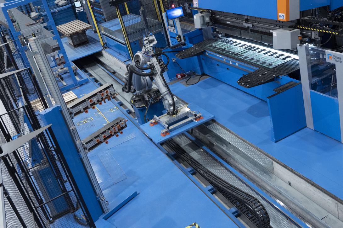 Automatický skladovací systém Night Train připojený ke kombinovanému stroji Shear Genius a robotickému ohýbacímu systému, které se skládá z ohýbacího centra Fast Bend FBe a ohraňovacího lisu EP 1030, je základním kamenem rozmanité výrobní činnosti, která vyžaduje vysoký výkon a produktivitu, stejně jako flexibilitu a všestrannost pro efektivní zvládání jakýchkoli změn výrobku.