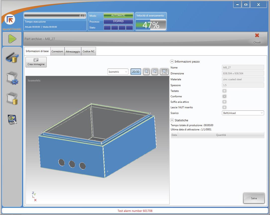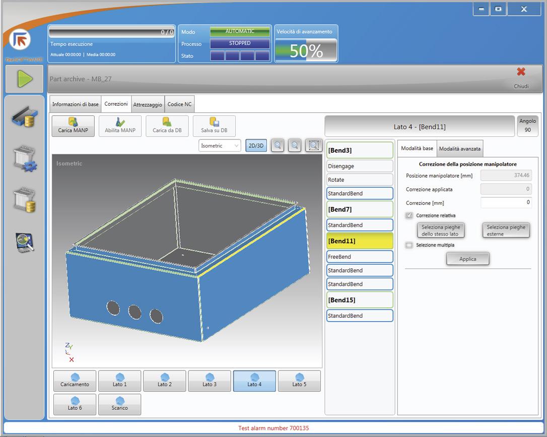 Ohýbací centrum a kontrola grafiky dílů, která pomáhá obsluze (horní nástroj, ASP, AUT, středicí polohovací kolíky, manipulátor a možnosti)