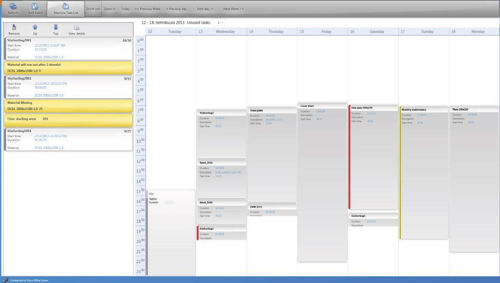 Seznam úkolů zobrazuje všechny automatické a manuální úkoly výrobního cyklu. Automatické úkoly jsou například spuštění výrobního příkazu a výměna kazety (pokud je připojen automatický sklad). Manuálními úkony jsou například výměna nástrojů v revolveru a přidávání materiálu. Seznam úkolů také informuje obsluhu o tom, kdy je třeba vyčistit stohovací plochu.