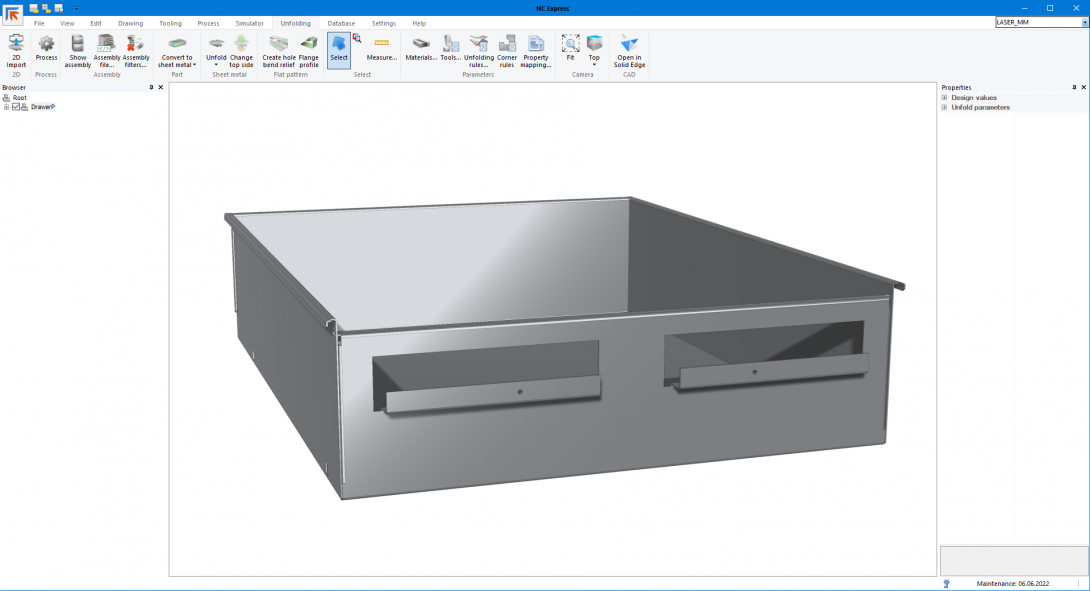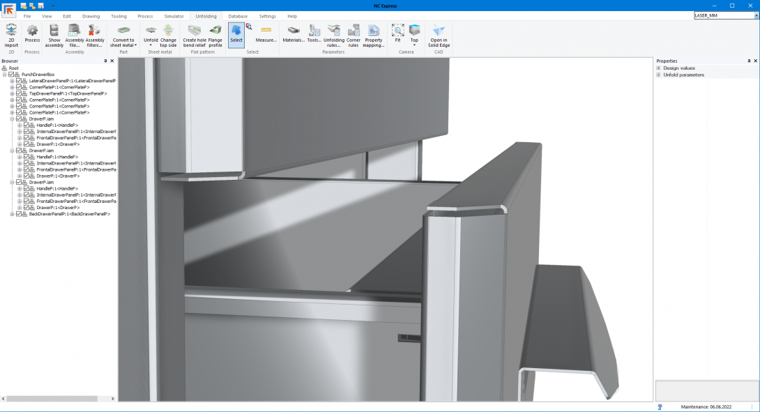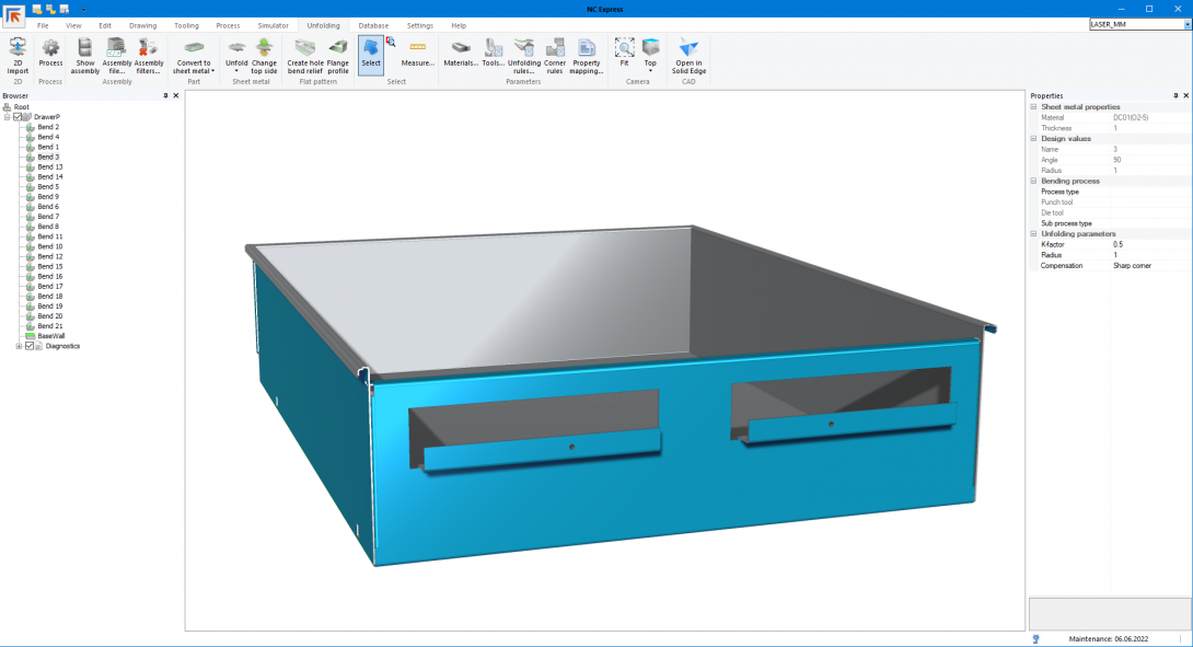 Una amplia variedad de importadores de archivos 3D nativos facilita la lectura de modelos 3D de diversos programas de CAD. Se crean patrones planos desplegados con precisión a partir de un conjunto o de un modelo de pieza única. El patrón plano contiene toda la información necesaria para su posterior procesamiento, ya sea en un punzón, un láser o una máquina de cizallado.