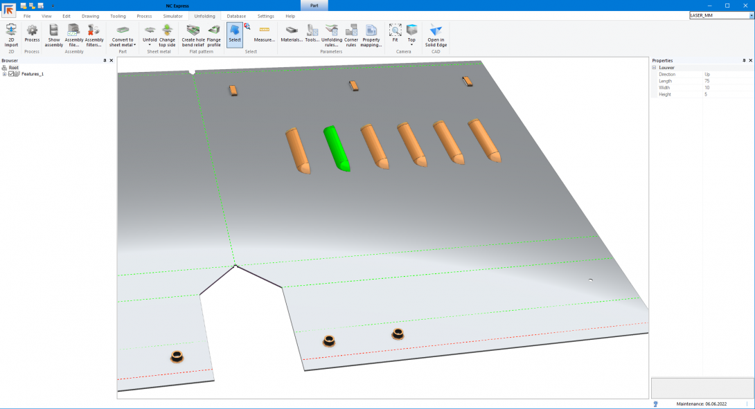 NC Express es compatible con la programación automática obtenida de los datos del modelo CAD y del pedido de ERP a los programas NC. Puede añadir automáticamente cortes por láser y golpes de punzón en los archivos de geometría o utilizar scripts para las piezas paramétricas. A través de la base de datos de pedidos se pueden importar los datos de los pedidos, anidarlos en chapas, optimizarlos y procesarlos posteriormente en programas NC.