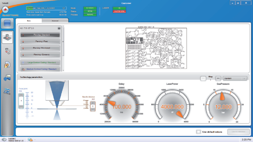 Käyttäjä voi käyttöoikeuksistaan riippuen siirtyä teknisten laserparametrien tietokantaan ja tehdä muun muassa seuraavia toimia: muuttaa arvoja, vertailla parametritaulukoita, kopioida, liittää ja poistaa arvoja.
