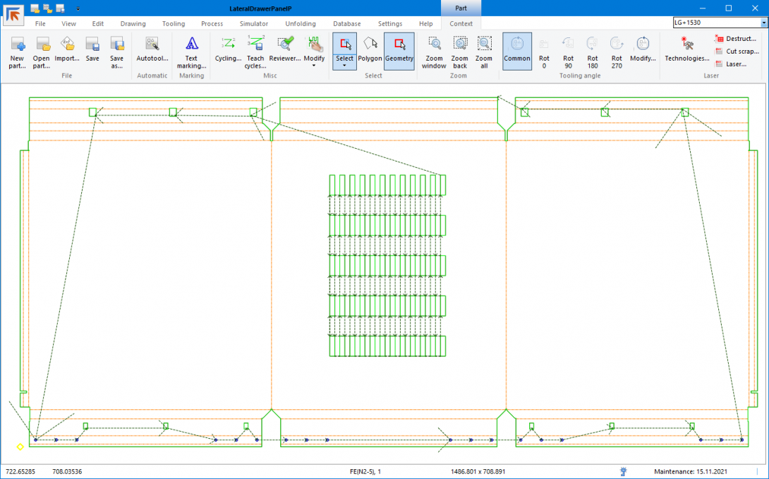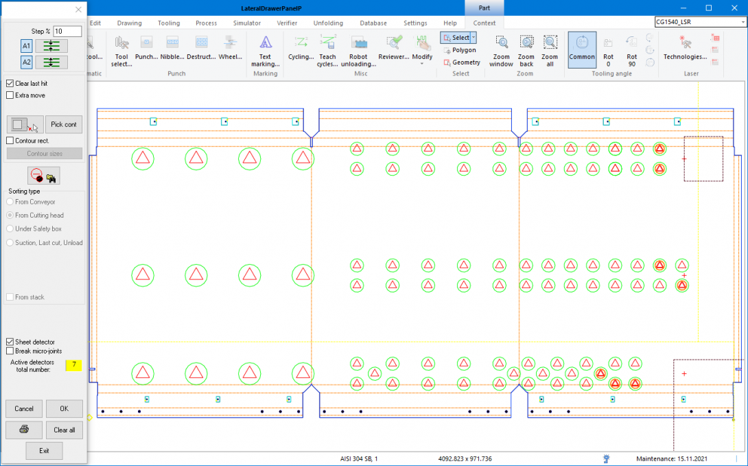 - Simulointi: visuaalinen simulointi auttaa varmistamaan, että leikkuu- ja lävistyssekvenssi on optimaalinen. Sama simulointiajo koneella takaa NC-ohjelman luotettavuuden ja täyden yhteensopivuuden.