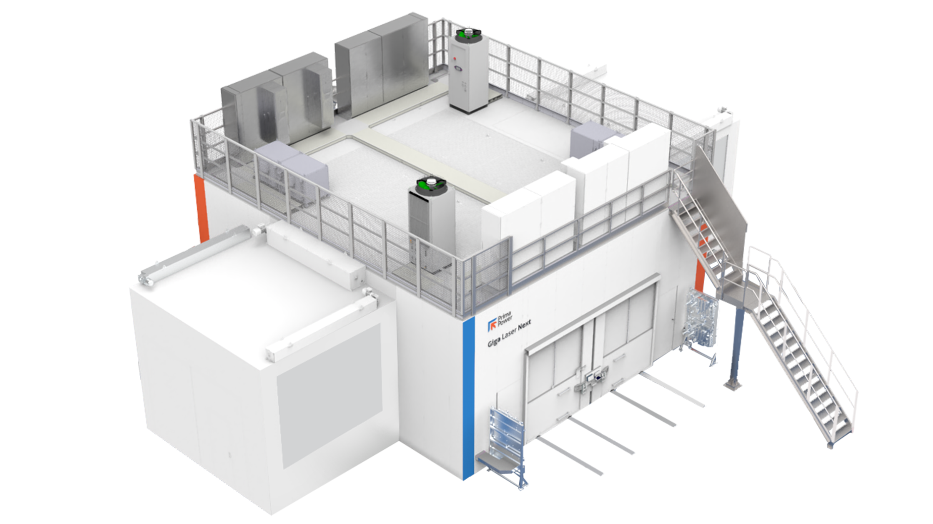 TEHOKAS TILANKÄYTTÖ – Kompakti Giga Laser Next on kooltaan 10 x 10 m, ja sen liitännäislaitteet (esim. laserlähteet ja jäähdyttimet) sijaitsevat koneen päällä olevalla tasolla.