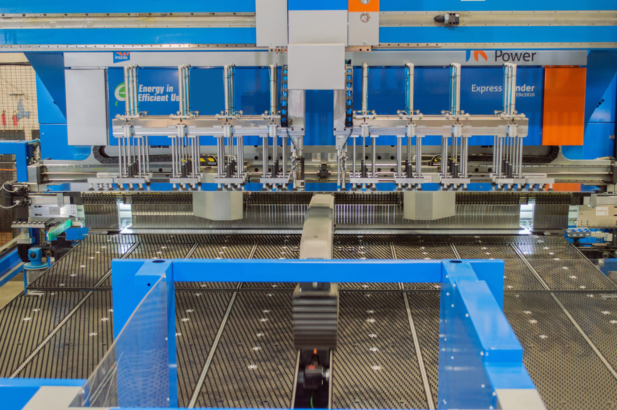 라인은 공식적으로 PSBB(펀치, 전단, 버퍼링 및 벤딩)라고 하며, 버퍼링 장치는 모든 것이 라인을 통해 원활하게 흐르도록 생산 속도를 조절하는 데 도움이 됩니다. 예를 들어, SGe에서 많은 펀칭 또는 성형이 필요하지 않은 부품의 경우 전단이 스태킹 로봇을 매우 빠르게 앞지를 수 있습니다. 이를 방지하기 위해 부품을 펀치/전단기 에서 분리한 후 버퍼링 합니다. 여기서 로봇이 패널 벤더를 공급하기 위한 준비를 위해 부품을 쌓거나 성형이 필요 없는 경우 종료할 수 있을 때까지 부품을 고정합니다.