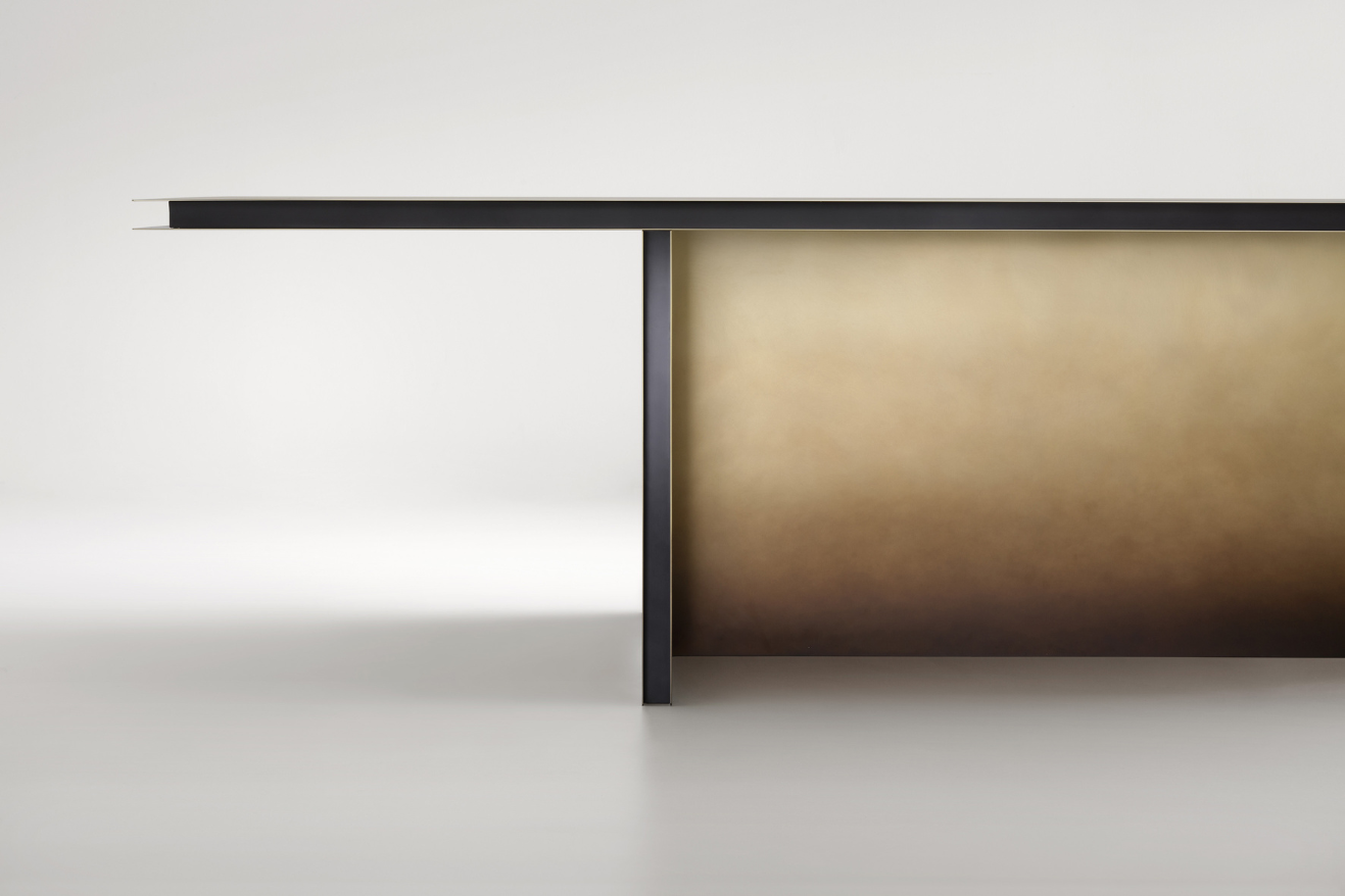 Metaal, gewaardeerd om zijn technische eigenschappen zoals stijfheid, sterkte en het vermogen om ingewikkelde vormen te vormen, wordt al heel lang gebruikt in design en architectuur. Ooit werd metaal louter als constructie gezien, maar wij hebben ervoor gekozen om het esthetische potentieel ervan te benadrukken door middel van een spel van contrasten. Ondanks het gewicht geven we onze creaties een gevoel van lichtheid. Metaal wordt vaak gezien als koud, maar we hebben het geïntegreerd in huiselijke omgevingen en roepen warmte en comfort op door oxidatie. Materiaal staat centraal in ons werk en gaat verder dan de functie. In plaats van het te verbergen, accentueren we de bepalende kenmerken ervan, zoals oxidatie. We versnellen dit proces zelfs om voorgeoxideerde afwerkingen te verkrijgen, een bewijs van onze eerbied voor het materiaal.