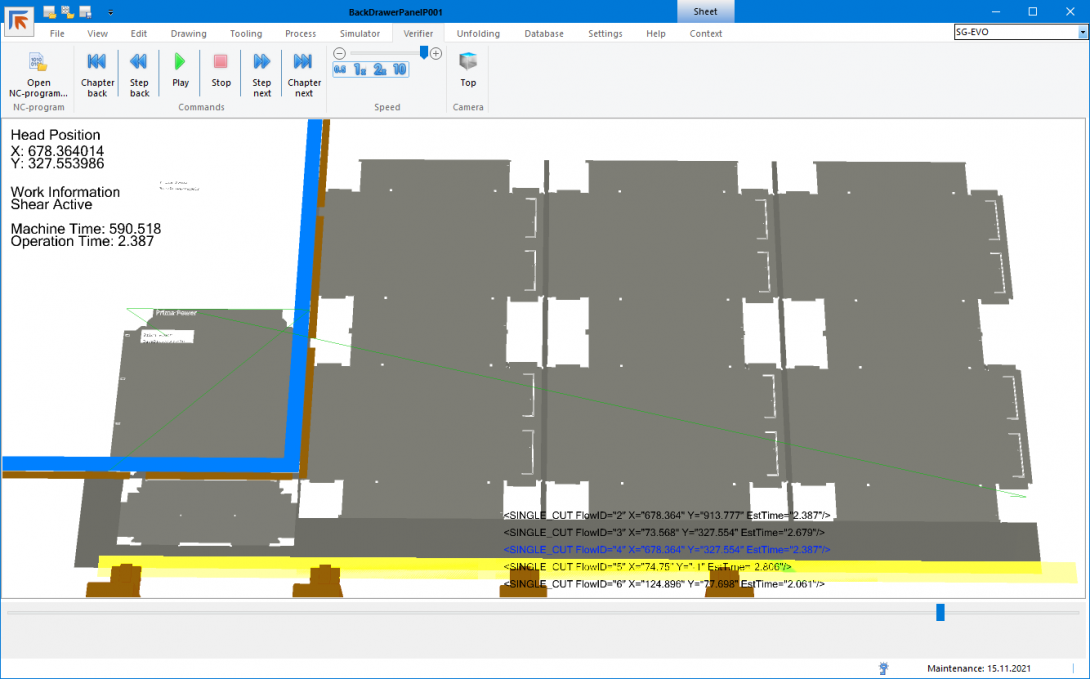 - Simulator: Visuele simulatie helpt om te controleren of de snij- en ponsvolgorde optimaal is; dezelfde simulatie wordt op de machine uitgevoerd om de betrouwbaarheid en volledige compatibiliteit van het NC programma te garanderen.