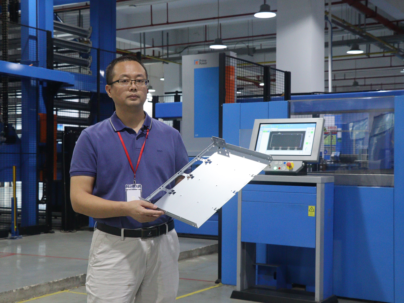 While holding a bent sheet metal part, Luo Yuanping explained: “This part was produced using Prima Power’s automated production line, which integrates multiple processes such as feeding, shearing, punching, sorting and bending into one.
