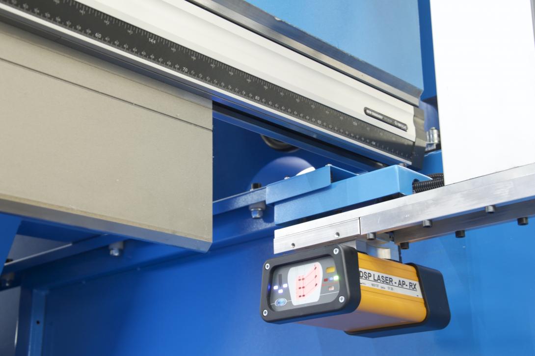 Dois sensores de precisão adaptam-se em tempo real à deformação do êmbolo: o primeiro deteta o rendimento do êmbolo desde o início da dobragem, o CNC ativa os cilindros no êmbolo inferior até que a leitura do segundo sensor seja igual ao primeiro.