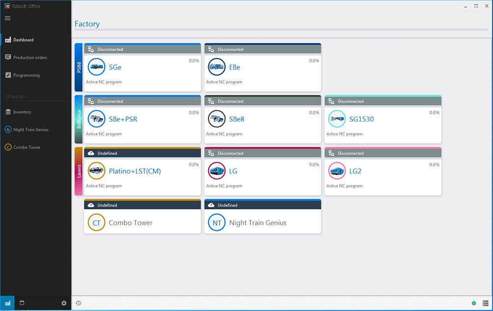 Tulus® Office는 BASIC, CLASSIC, PREMIUM으로 구분되는 툴 스위트 소프트웨어로 작업계획을 수립하고 설비 생산량을 제어할 때 사용합니다. 설비 여러 대의 상태와 작업 목록을 동시에 추적하고 완성된 생산계획이나 고객 데이터베이스 기능을 활용할 수도 있습니다.