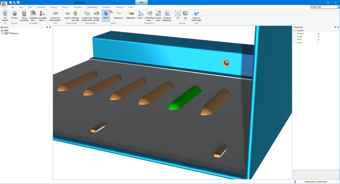 Широкий набор встроенных инструментов импорта 3D-файлов позволяет легко открывать файлы с трехмерными моделями из различных CAD-программ. Пользователь может создавать точные развертки на базе простой или составной модели. Развертка содержит всю необходимую информацию для дальнейшей обработки на дыропробивном, листорезном станках или на станке лазерной резки.