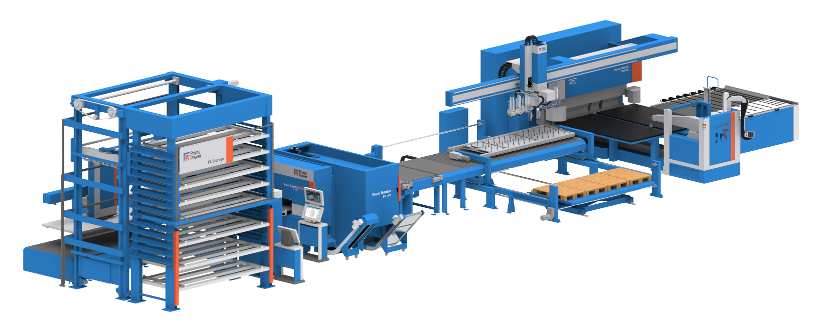 Линия обработки листового металла PSBB Prima Power автоматически изготавливает из листовых заготовок гнутые высококачественные детали. Линия PSBB - это Пробивка + Отрезка + Промежуточное хранение+ Гибка.