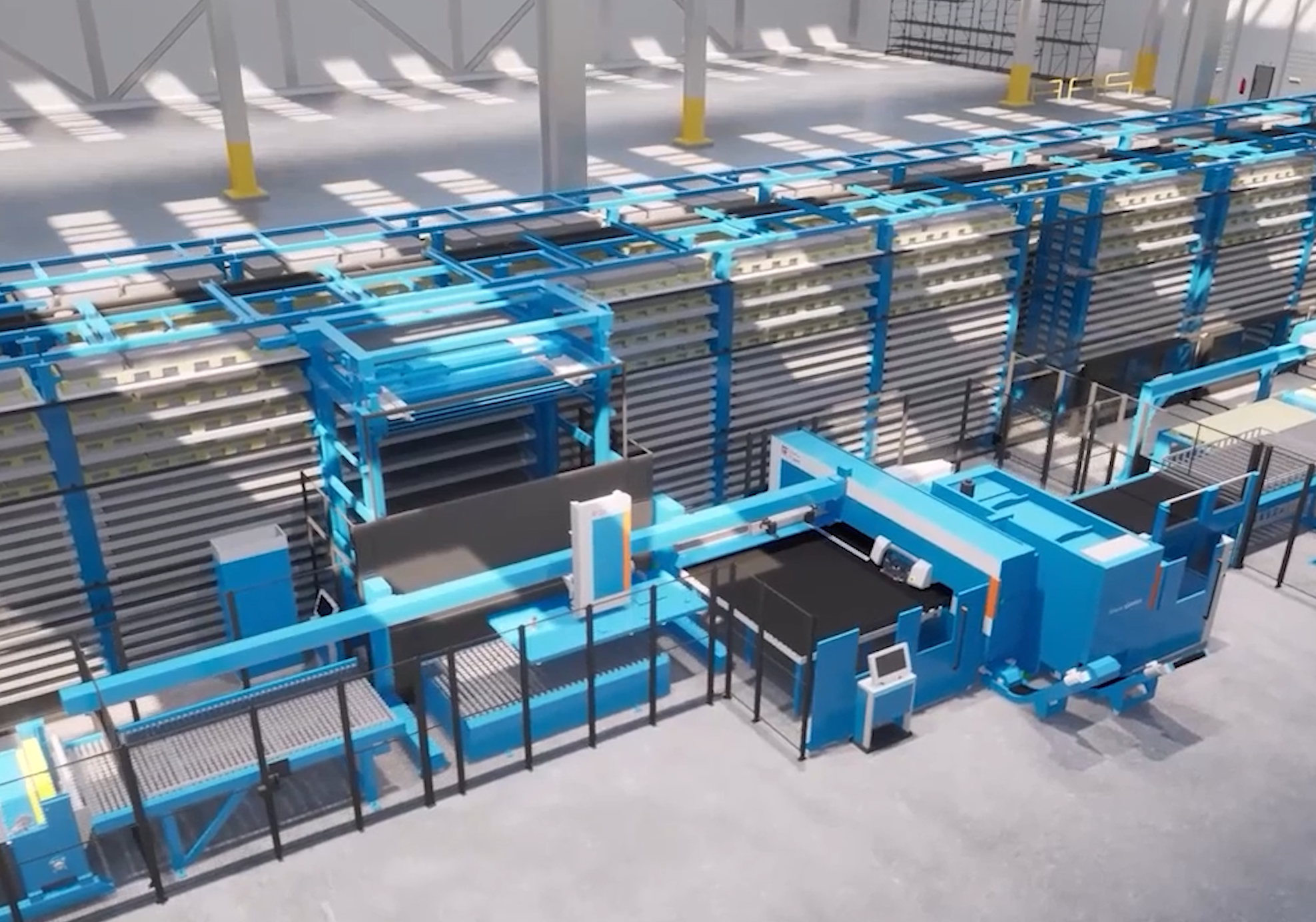 Захват устройства быстрой загрузки может захватывать листовой материал непосредственно из любой кассеты на стеллаже склада и перемещать листовой материал непосредственно к станку.