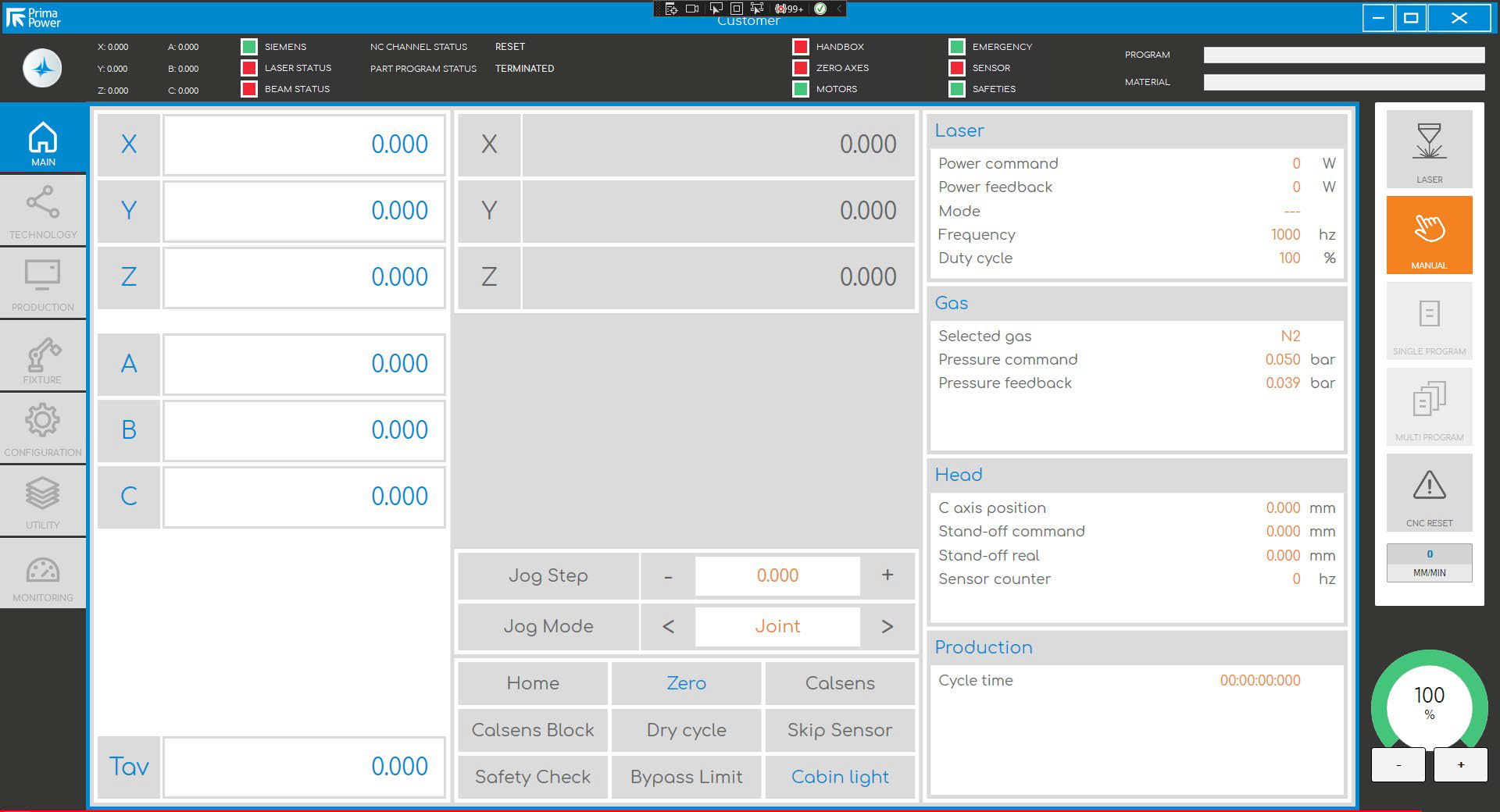 In addition, the system offers to the operator the possibility to customize cutting parameters (e.g. feed rate, cutting gas pressure and so on) online, directly on the touch screen panel, even during the laser process.