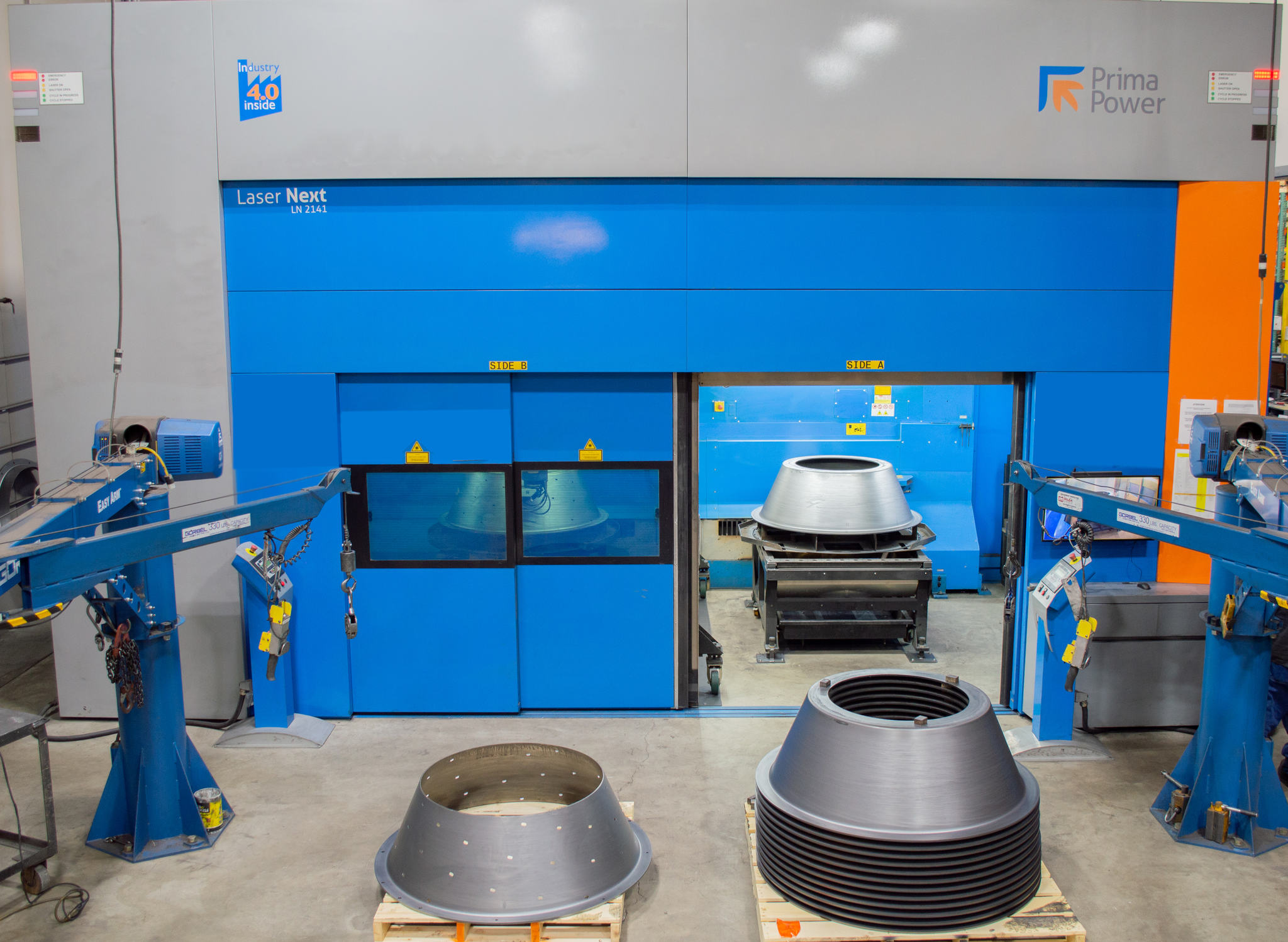 “我们购买了Laser Next 2141,因为它能适应我们零件的大直径,” 帕诺德指出。“我们需要购买最大的型号。Laser Next极大地缩短了我们的加工周期,使我们的生产项目产量增加了四到五倍。虽然新技术有一个适应过程,但Laser Next的表现非常好。”据帕诺德介绍,Laser Next 2141是一台用户友好的设备,普玛宝为Glenn Metalcraft操作员提供现场培训,以确保他们能够熟练操作。“我们的操作员对所接受的培训非常满意……这是一个非常直观的系统。自从我们的操作员开始接受培训以来,他们对设备操作起来非常熟练,” 帕诺德继续说道。“现在,我们只需要将尽可能多的工作转移到Laser Next加工中心。”激光和设备部门团队负责人亚伦·帕尔默(Aaron Palmer)补充道:“设备的速度对于轻量材料来说是惊人的。它最多可以切割厚达半英寸[12.7毫米]的材料,这点也让我非常满意。切割区域的大小对我们来说也非常重要。我们可以在几分钟内拆除中间的可移动隔板,这使我们的单舱切割空间增加了一倍多,允许我们加工非常大的零件。” 帕尔默补充道:“当我们加工最大体量的零件时,双工位的设计允许我们从一侧切换到另一侧。如果我们每班只运行一侧工位,我们每班可以生产24个零件。然而,同时运行双工位可以消除上料和下料时间,我们每班可以生产45个零件。当我们使用水射流切割时,我们平均每件零件需要45分钟。我们在Laser Next上的周期时间是每件零件8.5分钟。我喜欢这台设备的多功能性。我们可以在程序中从氧气切换到氮气切割。它不需要我们停下来更换透镜,我们可以在程序中直接调用材料库。某些零件的厚度在加工过程中会发生变化,我可以改变我的切割参数以适应厚度变化。”